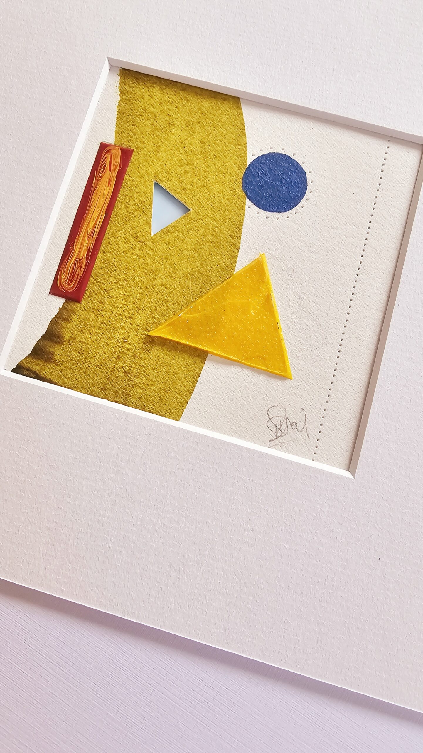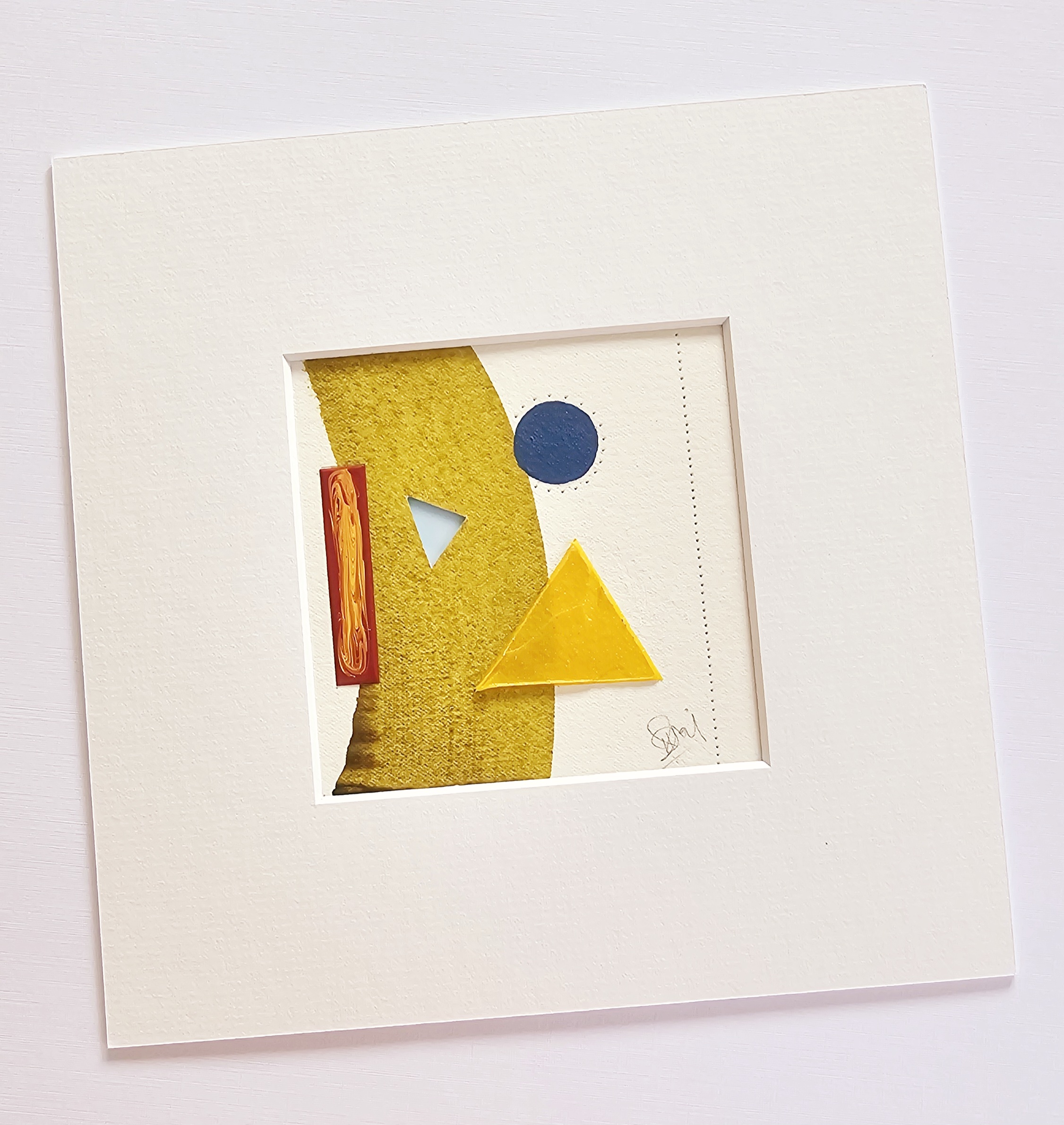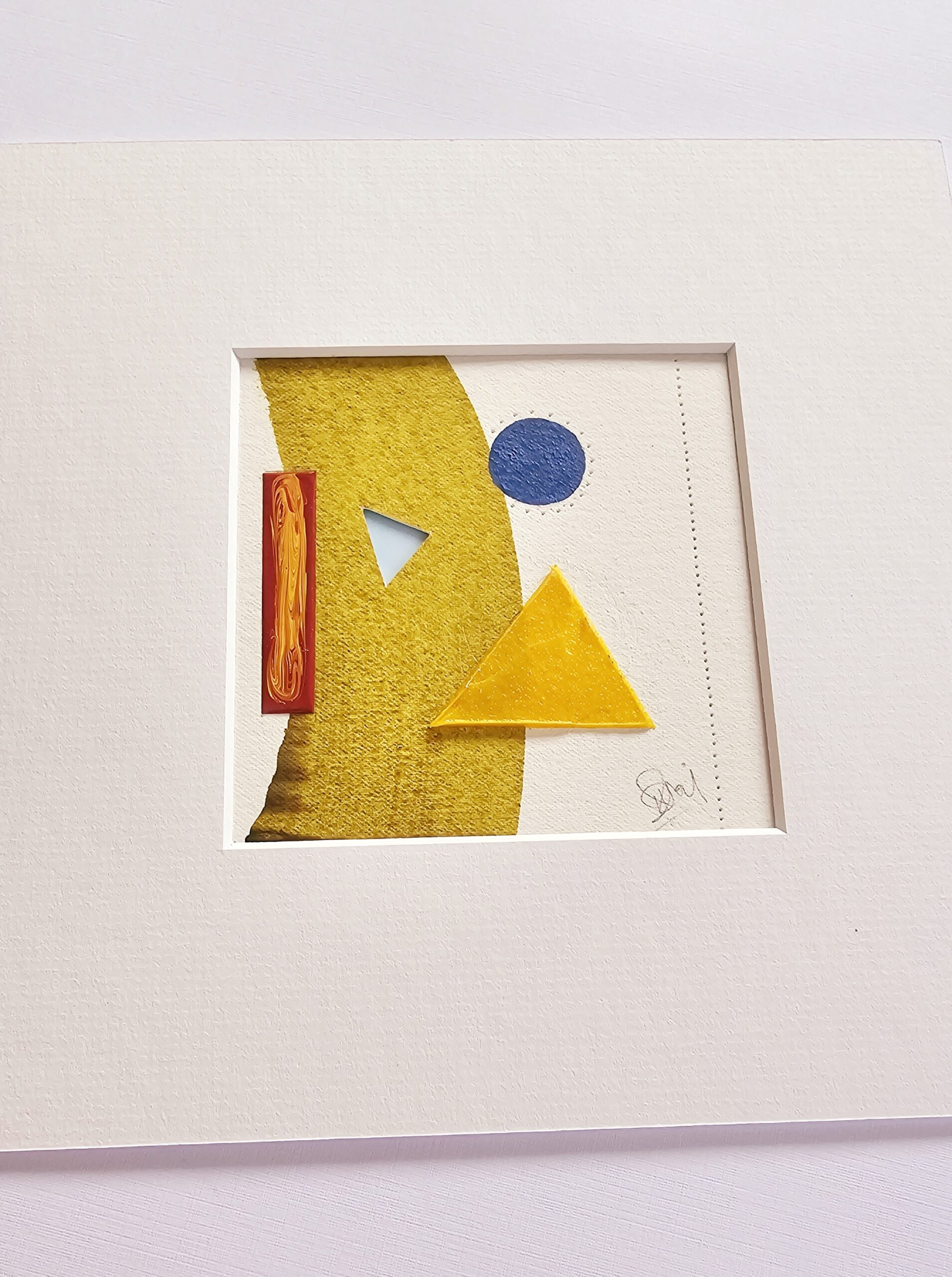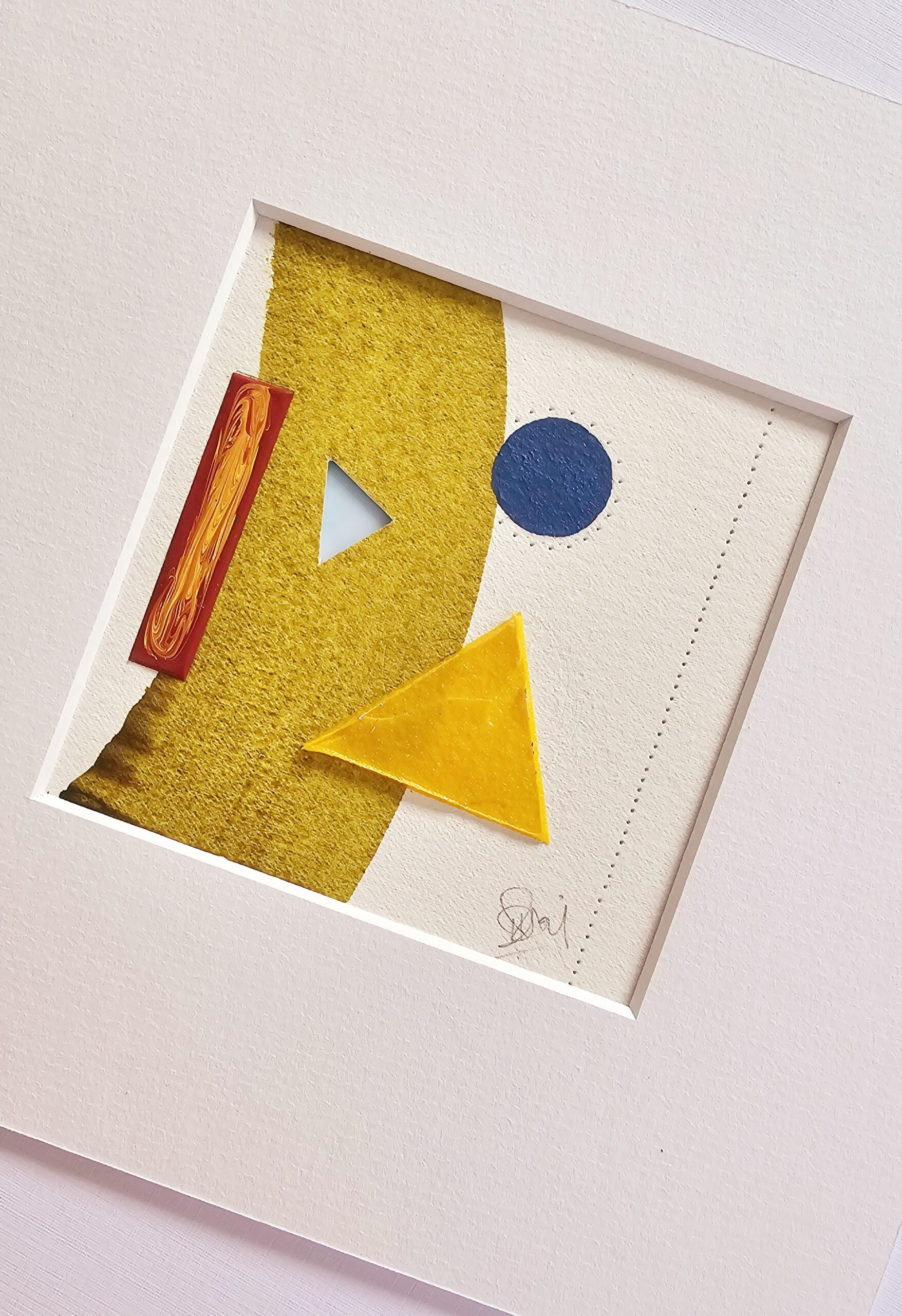 This original abstract mini artwork is a bold composition of color, form, and texture. A vivid yellow arc creates a radiant backdrop for a dynamic arrangement of shapes: a vibrant red rectangle with swirling texture, a soft blue triangle cutout, a dotted blue circle, and a translucent yellow triangle that catches the light beautifully.