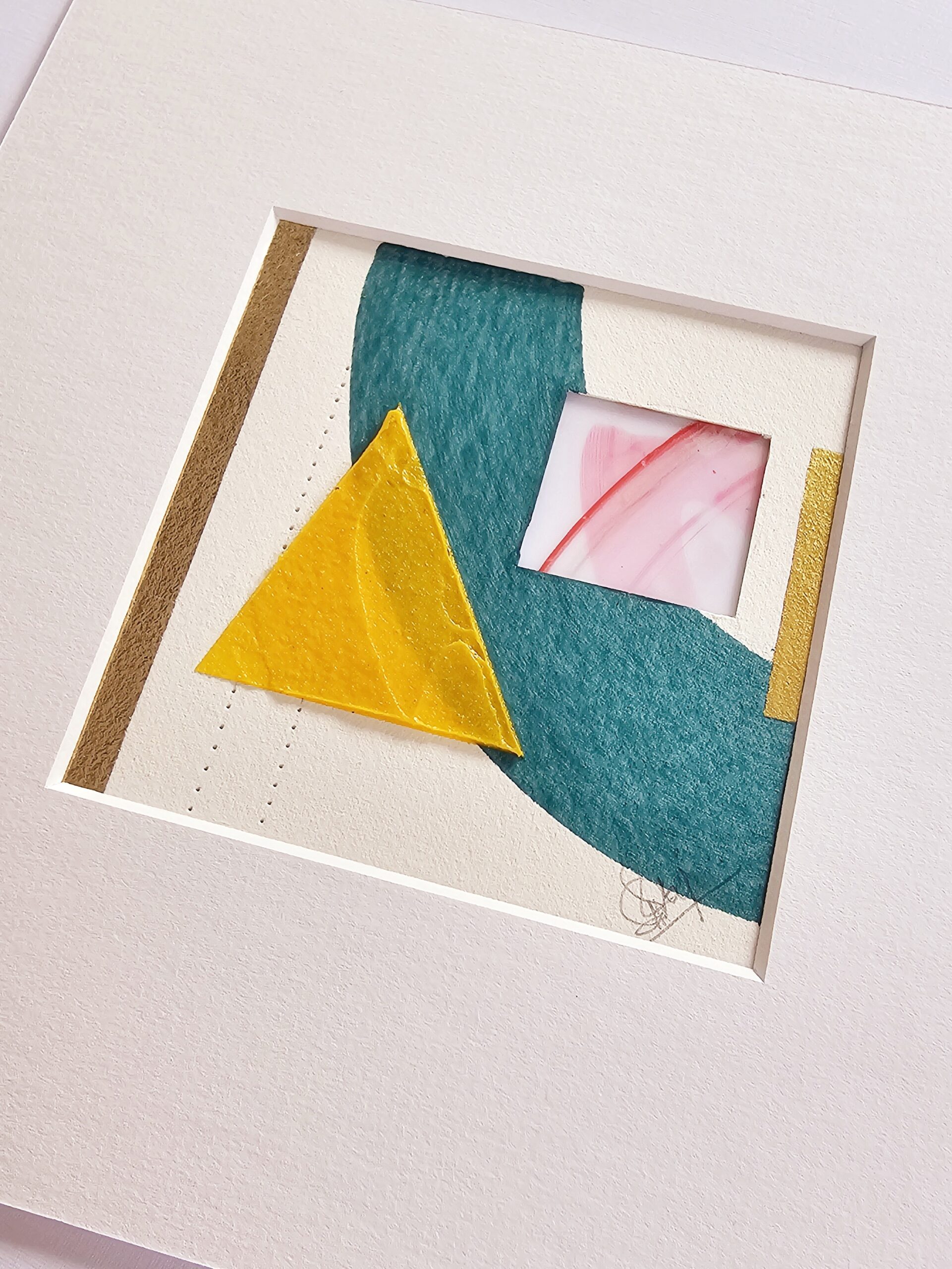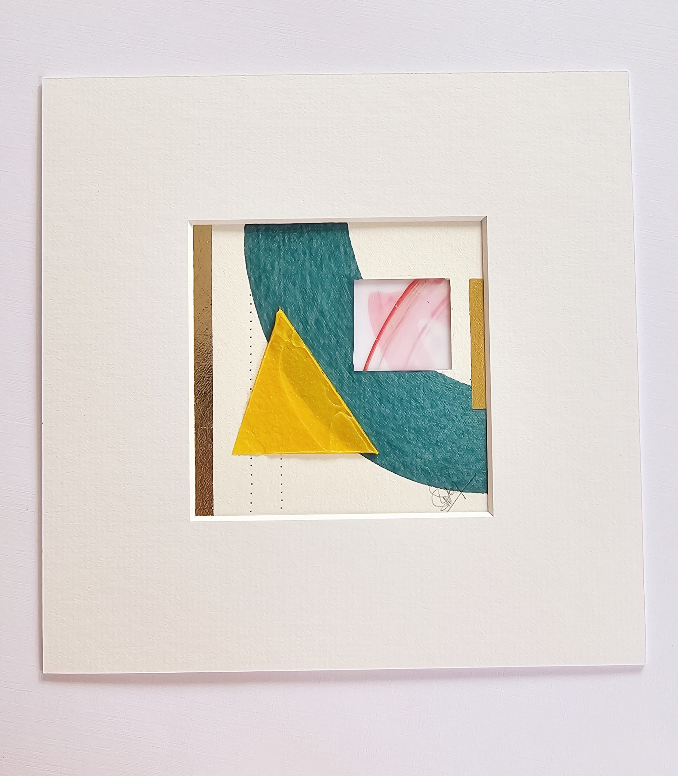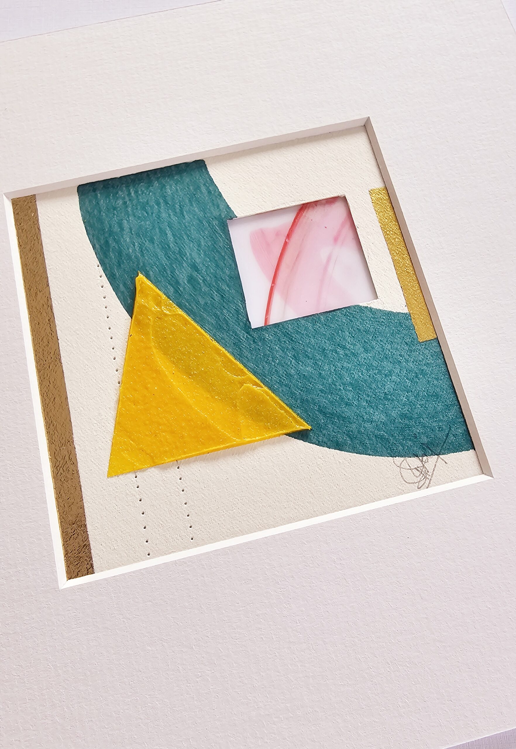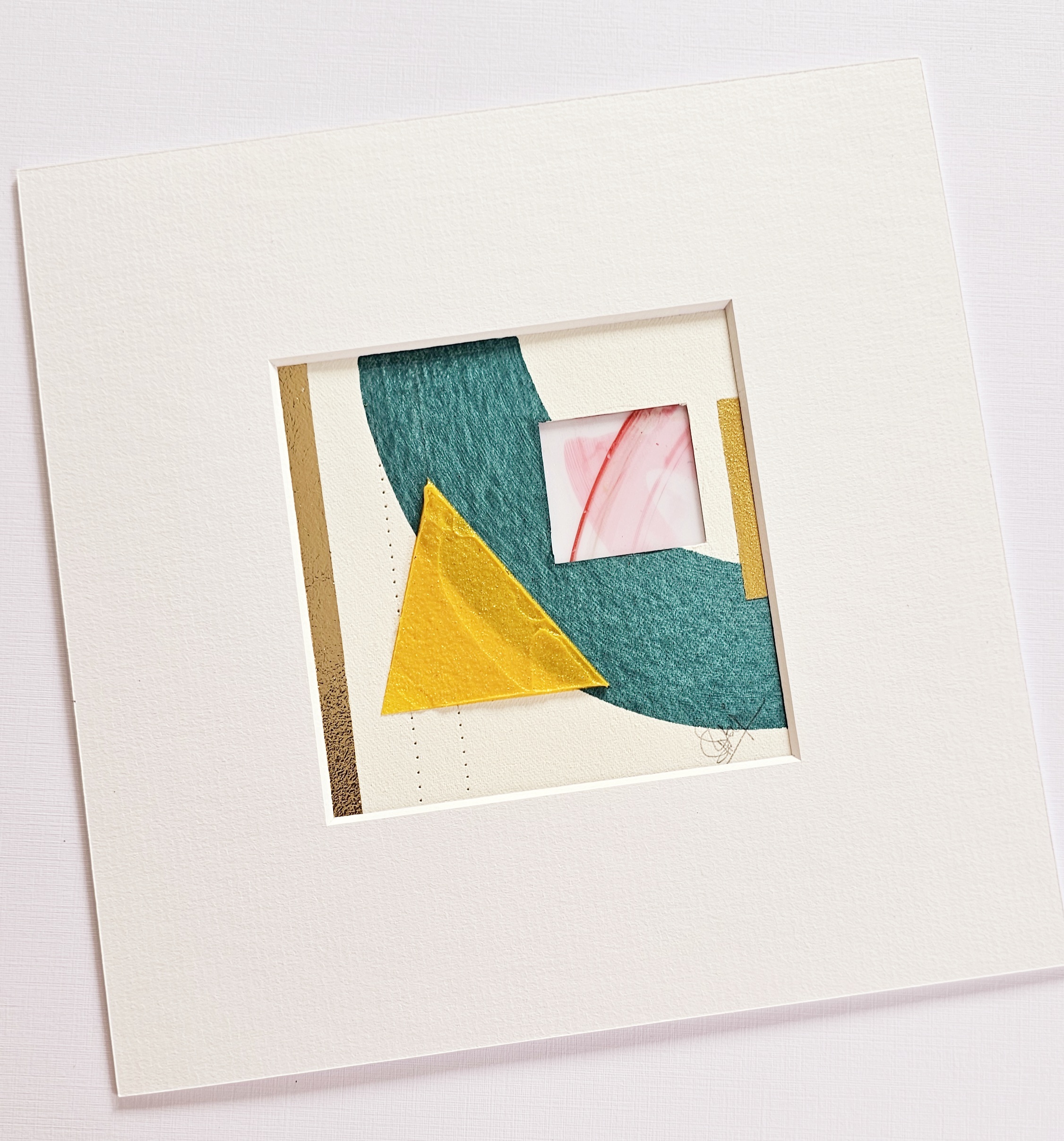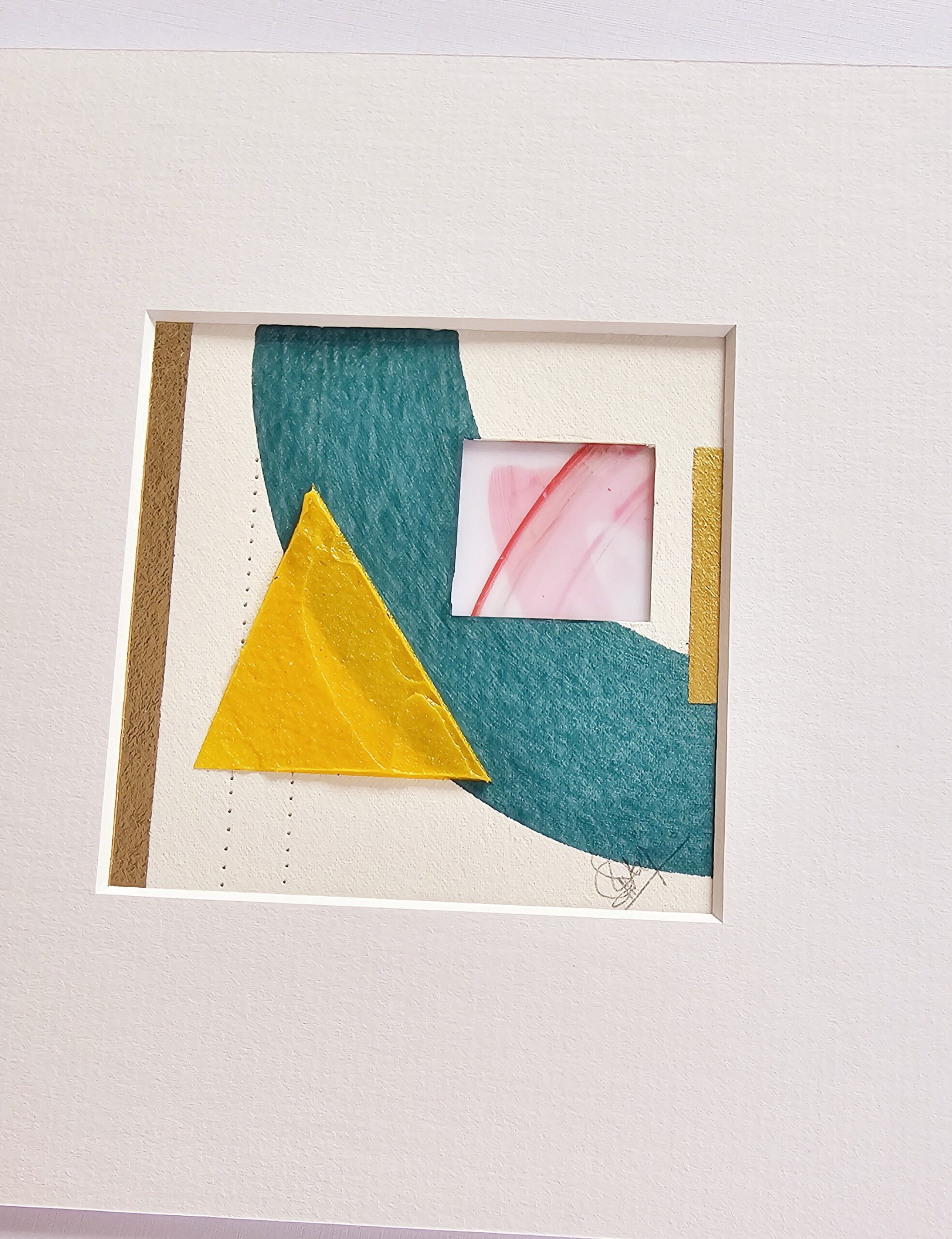 This original abstract mini artwork blends vibrant geometry with fluid expression. A sweeping teal arc curves across the surface, framing a glossy pink-and-white glass square that adds softness and depth. A textured yellow triangle pops in contrast, while golden accents and delicate dotted details complete the composition with elegance and rhythm.