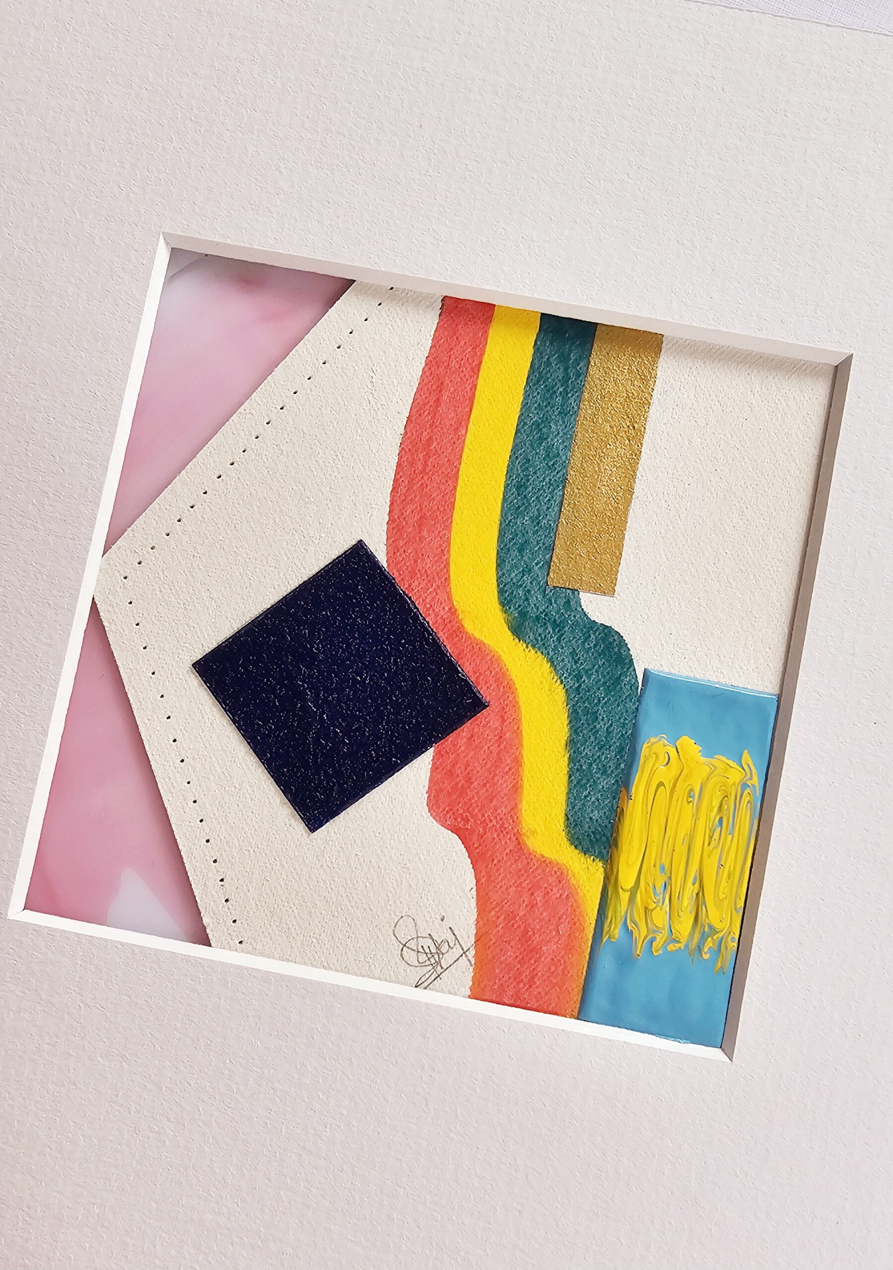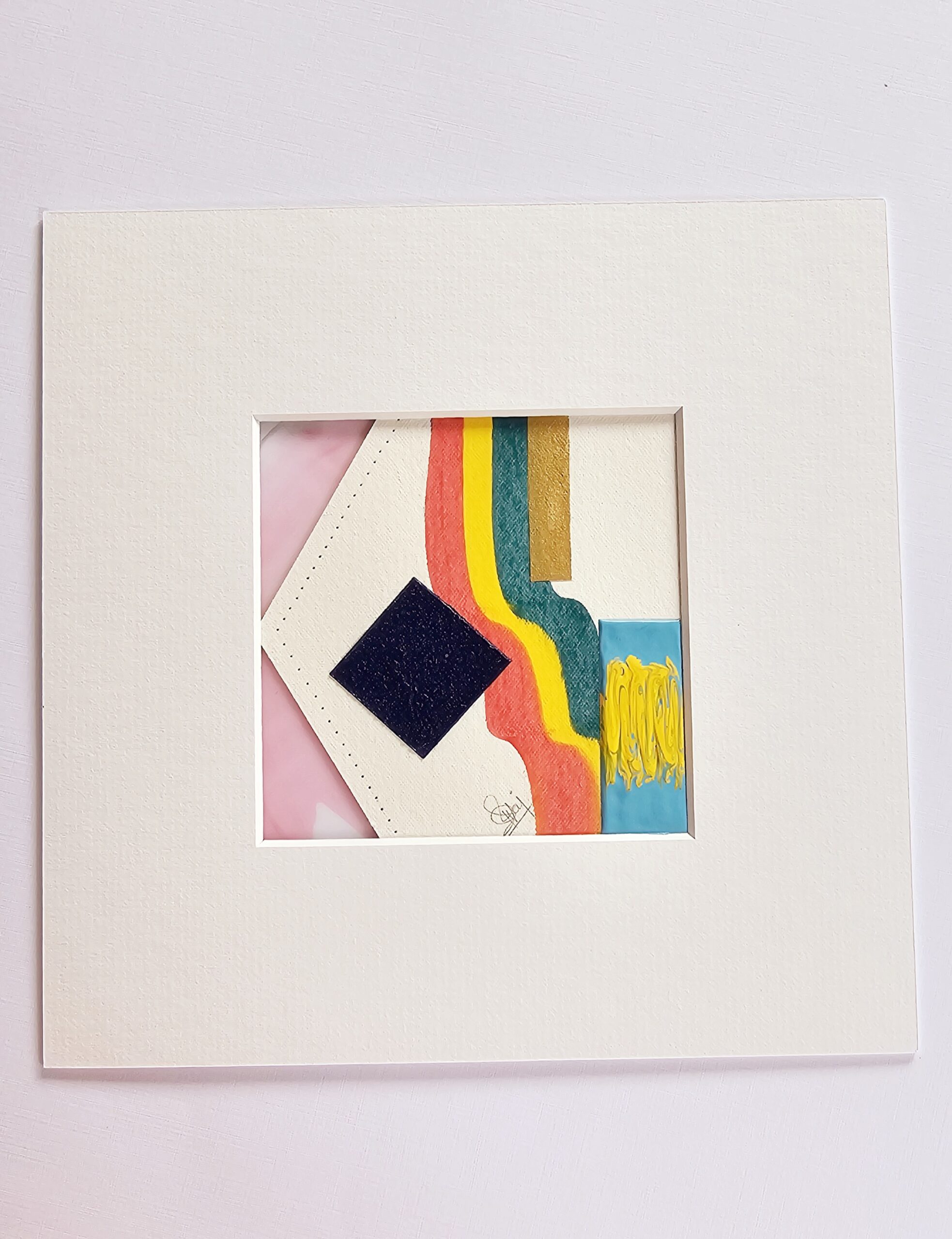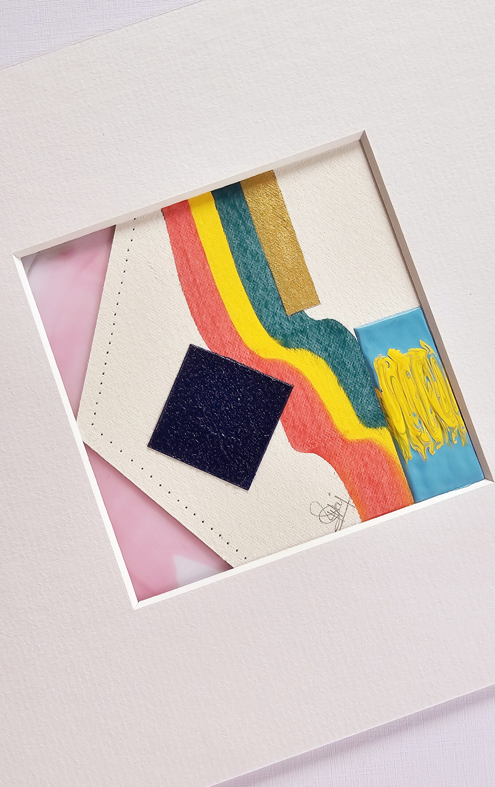 This original abstract mini artwork bursts with color and movement. A flowing ribbon of red, yellow, and teal arcs through the piece, contrasted by bold geometric forms—a deep navy square, a golden accent, and a lively blue rectangle with textured yellow detail. A pink marbled background peeks through the edge, adding softness to the structured composition.