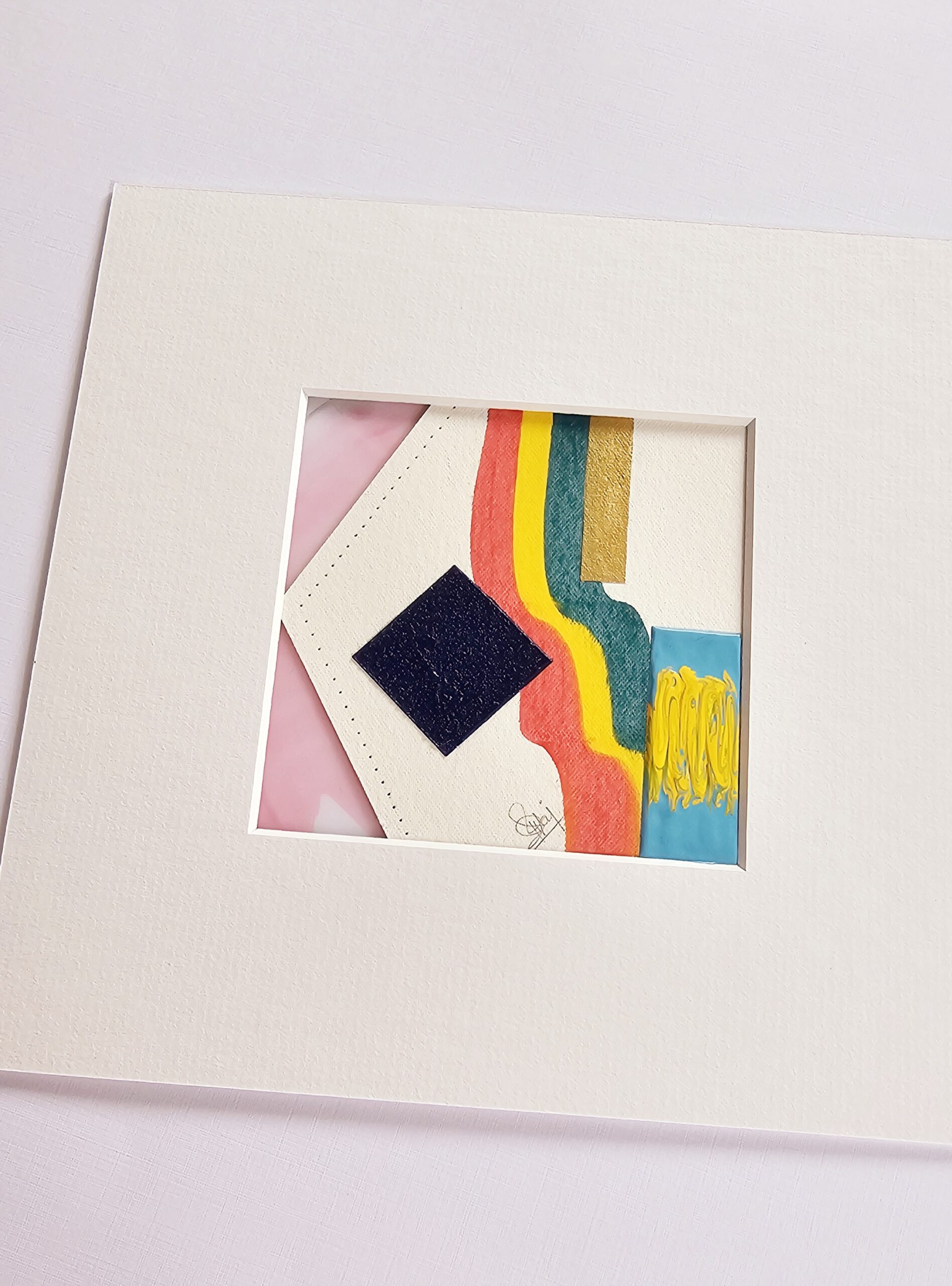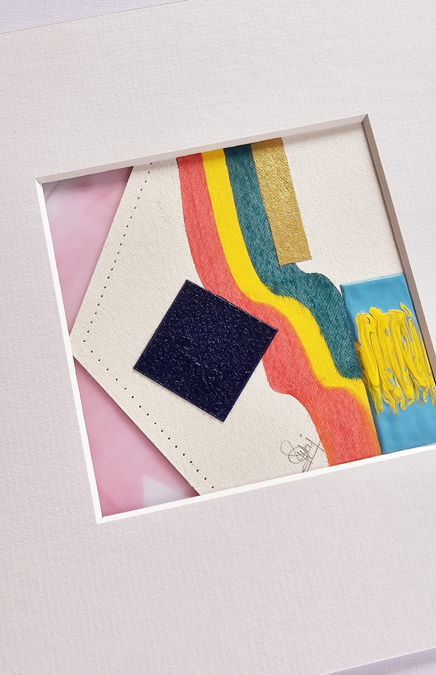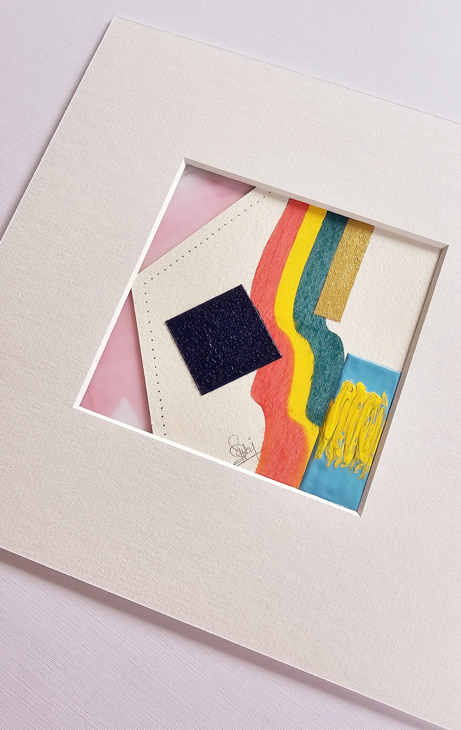 This original abstract mini artwork bursts with color and movement. A flowing ribbon of red, yellow, and teal arcs through the piece, contrasted by bold geometric forms—a deep navy square, a golden accent, and a lively blue rectangle with textured yellow detail. A pink marbled background peeks through the edge, adding softness to the structured composition.