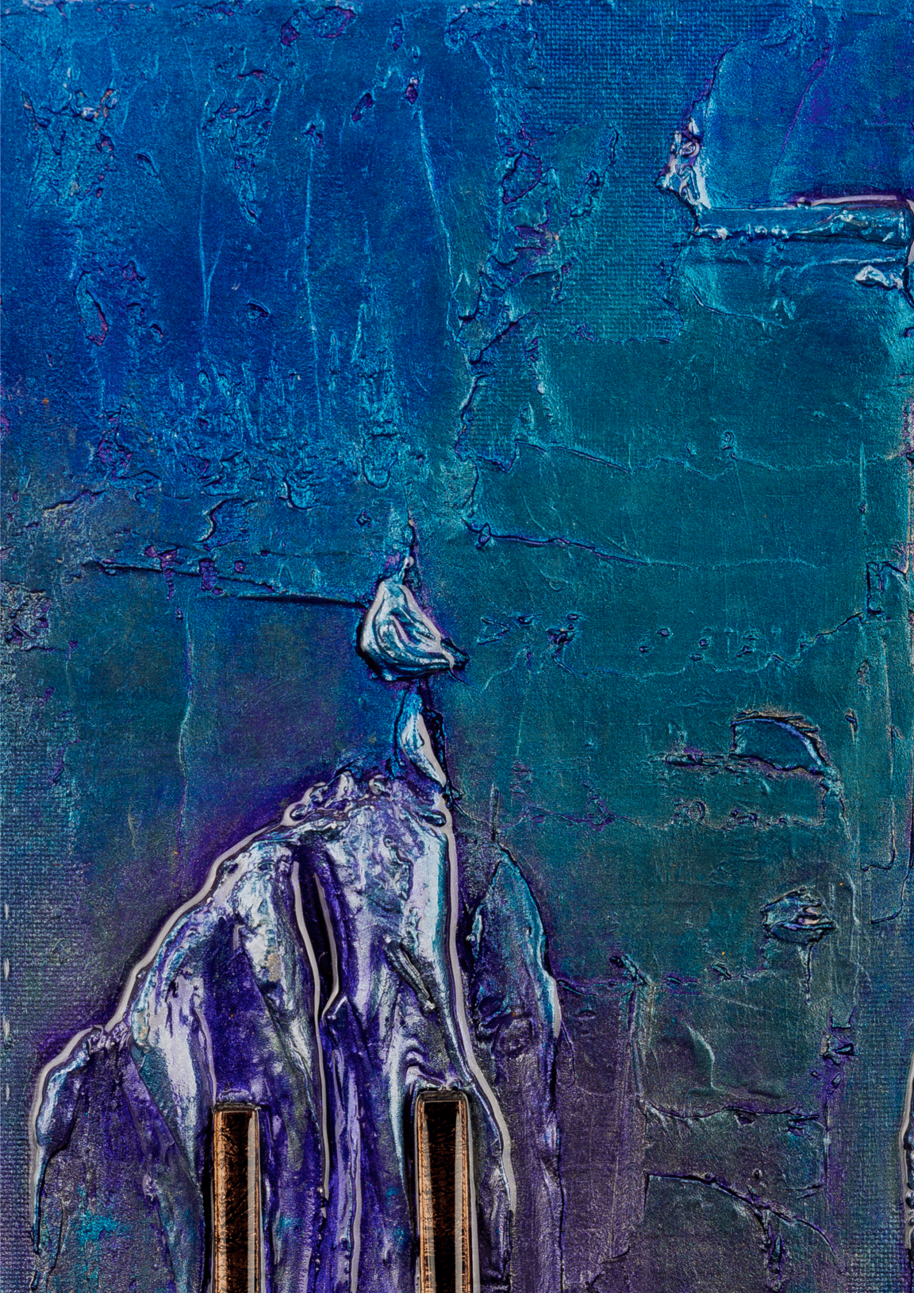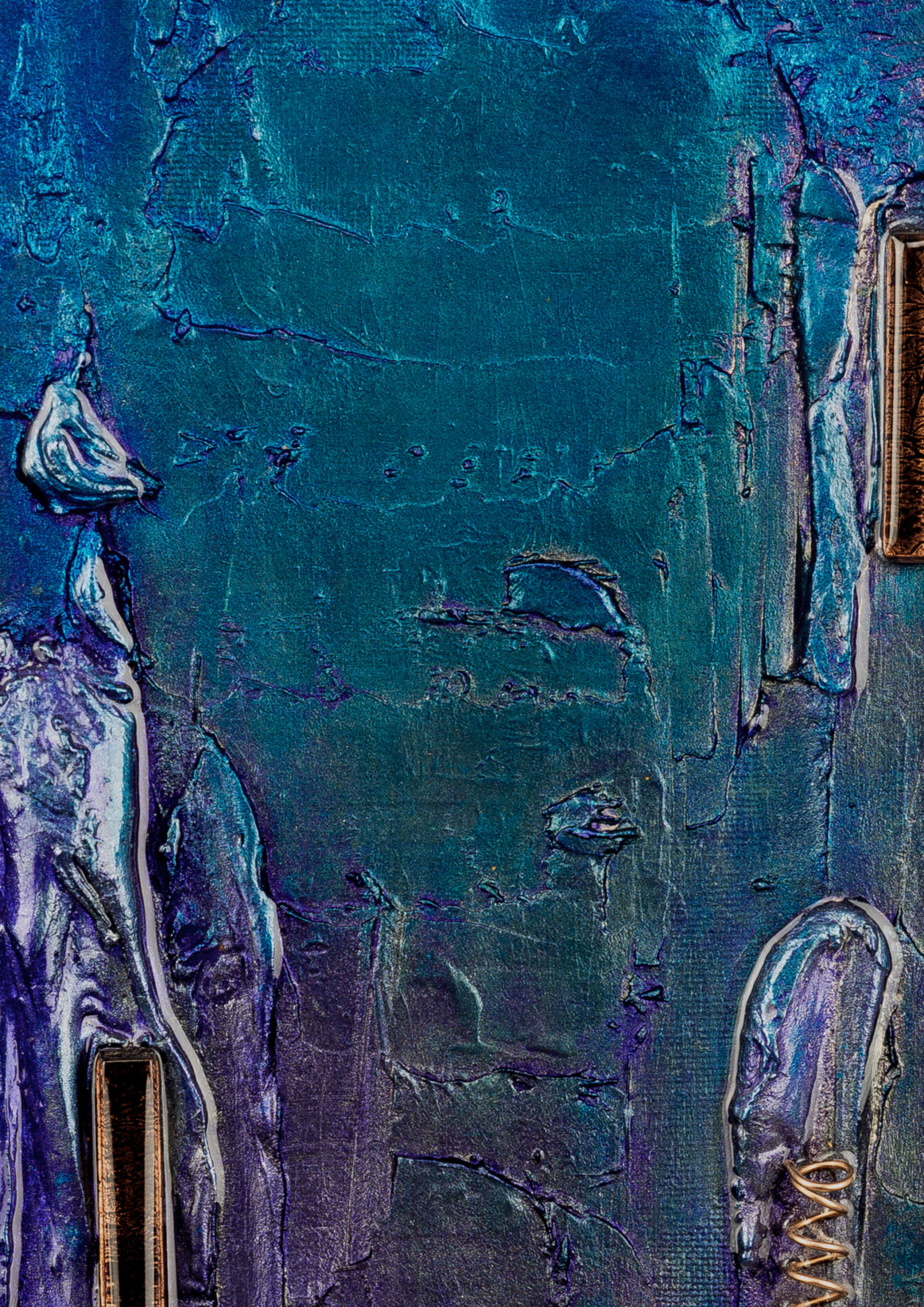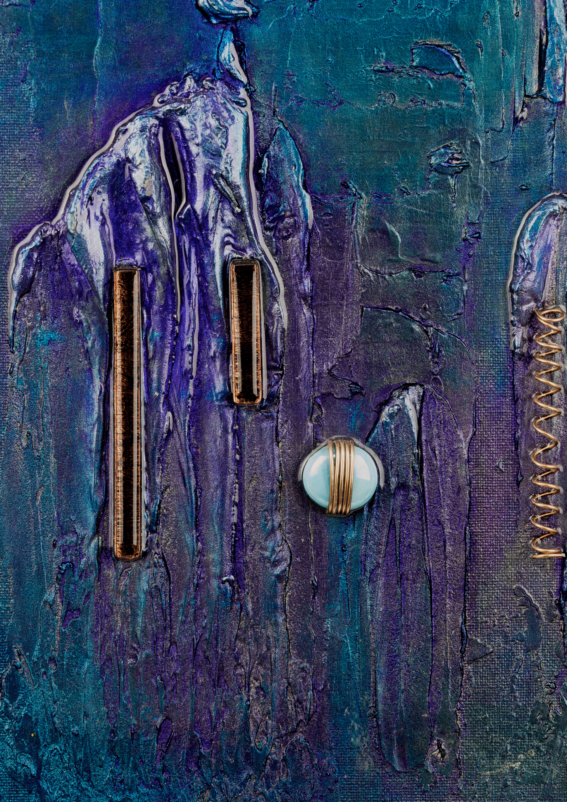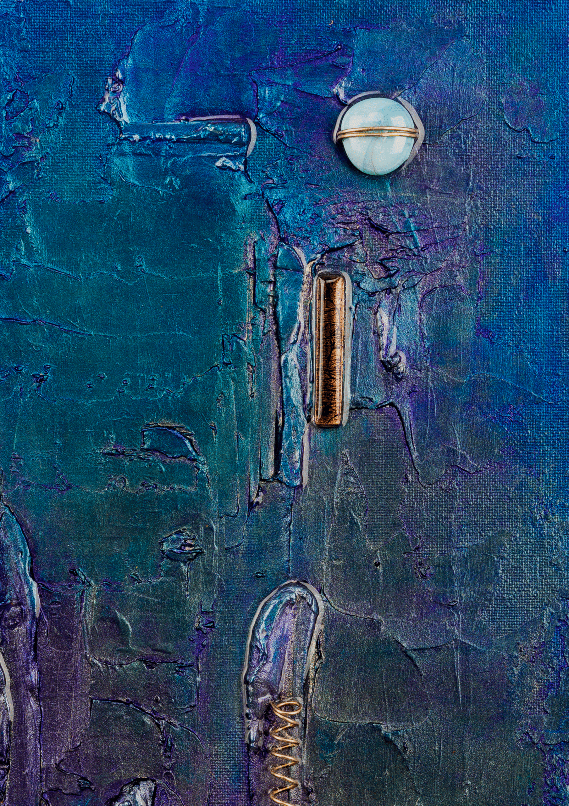 A coiled bronze wire is placed vertically within the surface, adding a dynamic, energetic element. The coil contrasts with the cooler blues and purples, its golden tones adding warmth. It symbolizes ocean currents and a sense of tension within the sea’s stillness.