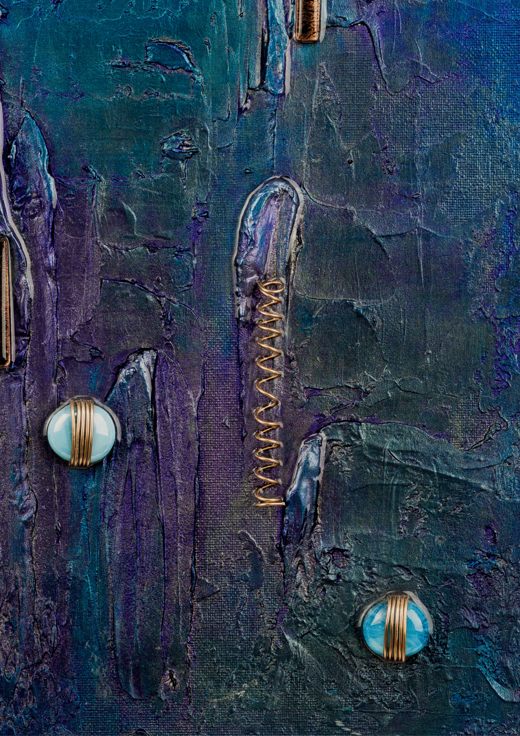 At the bottom right, another light blue glass stone wrapped vertically with bronze wire rests on the textured surface. Like the others, it becomes a focal point, bringing balance and grounding to the composition.