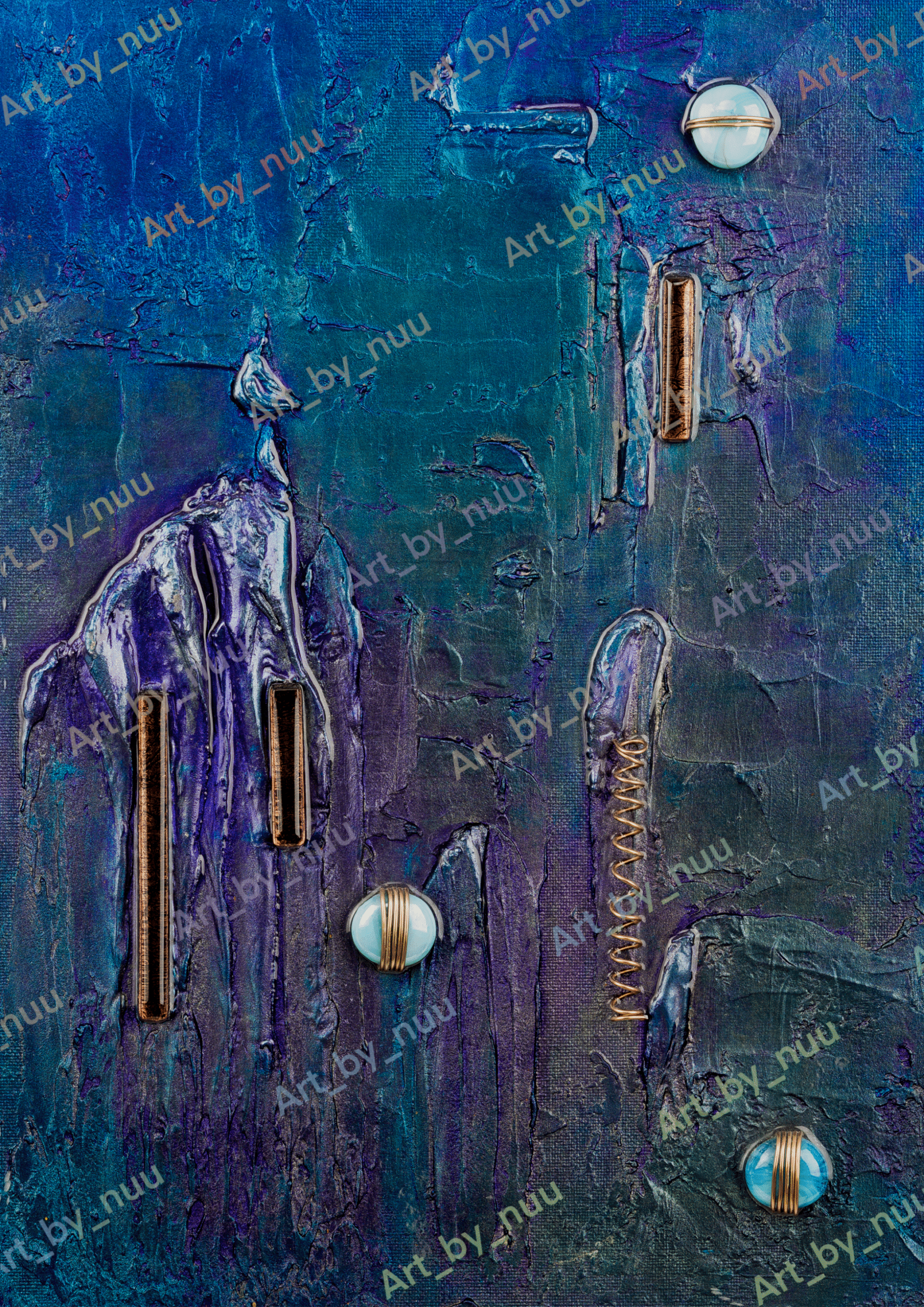 This artwork reflects the essence of quiet, dark sea nights, where stillness feels peaceful yet powerful. The deep blues and purples, along with the textured surface, create mystery, as if looking into the hidden layers of the ocean. The darker blues at the bottom add depth, while lighter blues and hints of turquoise at the top show upward movement, symbolizing a journey from darkness to light.